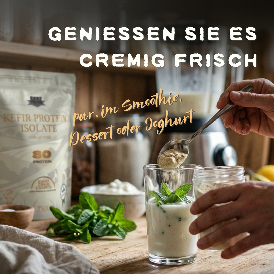 Kefir Protein Isolat ist die moderne Weiterentwicklung unseres beliebten Kefir Whey Proteins. Hergestellt aus irischer Weidemilch von grasgefütterten Kühen. Es ist ein laktosearmes schnell & leicht verdauliches Protein mit prä- und probiotischen Eigenschaften.